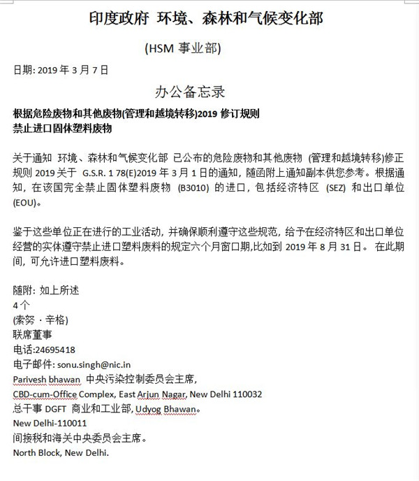3月13日,本網(wǎng)報(bào)道了《印度宣布將全面禁止進(jìn)口固體塑料廢物》。“近日印度環(huán)境、森林和氣候變化部發(fā)布一份官方聲明,稱印度政府已發(fā)布禁令,禁止印度(包括經(jīng)濟(jì)特區(qū)和出口型企業(yè))進(jìn)口固體塑料廢棄物。不過該聲明尚未透露這一禁令何時(shí)正式生效?!庇《日?環(huán)境、森林和氣候變化部(HSM事業(yè)部)日期:2019年3月...