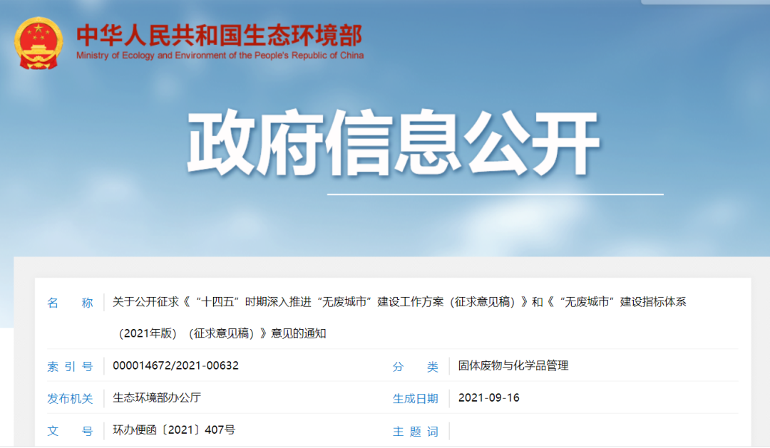 為深入打好污染防治攻堅(jiān)戰(zhàn),推動(dòng)形成綠色發(fā)展方式和生活方式,加強(qiáng)固體廢物系統(tǒng)治理,持續(xù)推進(jìn)固體廢物源頭減量和資源化利用,最大限度減少填埋量,有效防范生態(tài)環(huán)境風(fēng)險(xiǎn),指導(dǎo)地方做好“十四五”時(shí)期“無(wú)廢城市”建設(shè)工作,我部會(huì)同相關(guān)部門(mén)組織編制了《“十四五”時(shí)期深入推進(jìn)“無(wú)廢城市”建設(shè)工作方案(征求意見(jiàn)稿)》和...