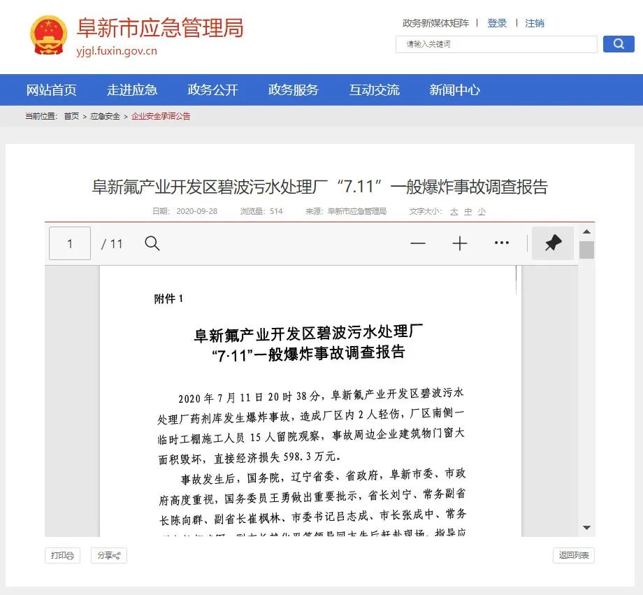 文章導(dǎo)讀近日,阜新市應(yīng)急管理局已經(jīng)發(fā)布了《阜新氟產(chǎn)業(yè)開(kāi)發(fā)區(qū)碧波污水處理廠(chǎng)“7.11”一般爆炸事故調(diào)查報(bào)告》(下稱(chēng)《報(bào)告》)。結(jié)果顯示,爆炸的直接原因是該污水廠(chǎng)違規(guī)使用氯酸鈉催化劑,在儲(chǔ)存時(shí)與赤砂糖發(fā)生化學(xué)反應(yīng)發(fā)生爆炸,爆炸現(xiàn)場(chǎng)形成的沖擊波相當(dāng)1.0-1.5tTNT當(dāng)量。還記得去年7月12日,遼寧省阜...