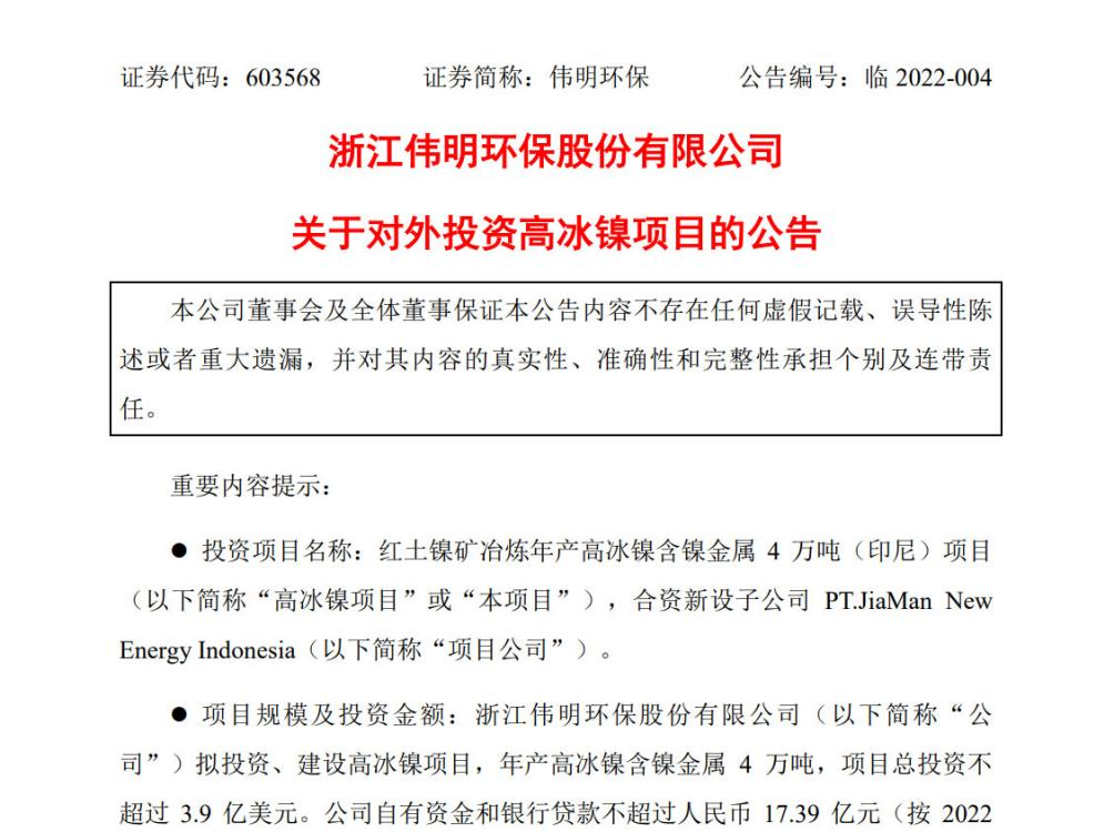 環(huán)保企業(yè)進軍新能源領域的越來越多了。1月5日晚間,偉明環(huán)保發(fā)布公告稱進軍新能源市場,擬在印尼投建高冰鎳項目。前一天,1月4日,旺能環(huán)境股份有限公司也發(fā)布公告,擬通過收購方式,布局新能源鋰電材料綠色循環(huán)再利用產(chǎn)業(yè)。再往前的2021年12月8日晚間,中國天楹還發(fā)布公告稱,以自有資金或自籌資金方式成立江蘇...