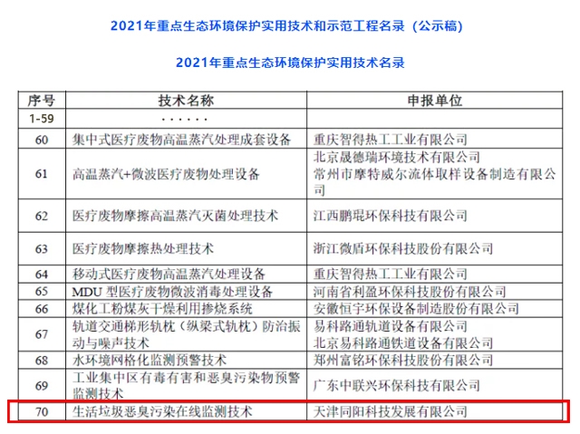 近日,中國環(huán)境保護(hù)產(chǎn)業(yè)協(xié)會公示了《2021年重點生態(tài)環(huán)境保護(hù)實用技術(shù)和示范工程名錄(公示稿)》,此次公示名錄共篩選出70項“2021年重點生態(tài)環(huán)境保護(hù)實用技術(shù)名錄”,65項“2021年重點生態(tài)環(huán)境保護(hù)技術(shù)示范工程”。其中天津同陽科技發(fā)展有限公司(以下簡...