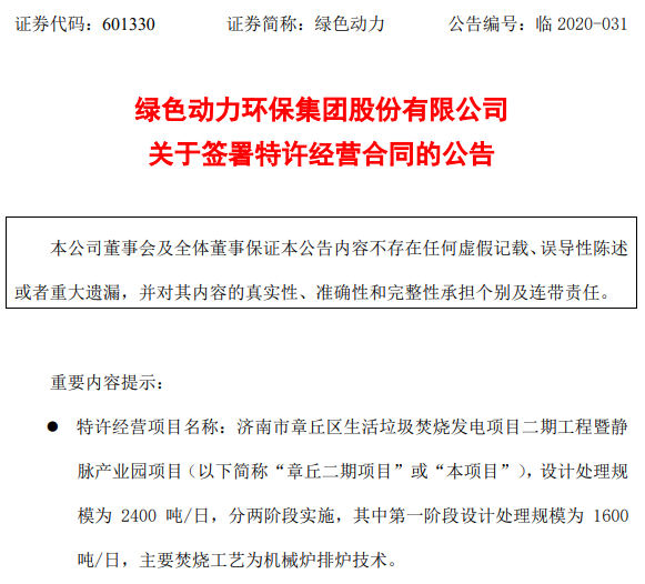 綠色動(dòng)力環(huán)保6月3日公布一則關(guān)于簽署特許經(jīng)營(yíng)合同的公告,公告顯示綠色動(dòng)力與濟(jì)南市章丘區(qū)環(huán)境衛(wèi)生管護(hù)中心簽署《章丘區(qū)生活垃圾焚燒發(fā)電項(xiàng)目二期工程暨靜脈產(chǎn)業(yè)園項(xiàng)目特許經(jīng)營(yíng)協(xié)議》,項(xiàng)目總投資約15億元(人民幣。下同),第一階段總投資約8.5億元,其中資本金約2.55億元。 綠色動(dòng)力環(huán)保集團(tuán)指出,該項(xiàng)目采用...