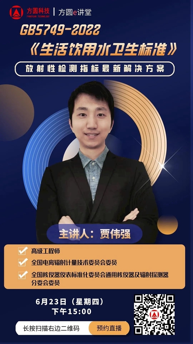 2022年3月15日,國家市場監(jiān)督管理總局和國家標準化管理委員會聯(lián)合發(fā)布GB 5749-2022《生活飲用水衛(wèi)生標準》,方圓e講堂為您帶來新標準中放射性檢測指標最新解決方案。 01 課程主題 GB5749-2022《生活飲用水衛(wèi)生標準》中放射性檢測指標最新解決方案 02 資深講師 賈偉強:高級工程師...
