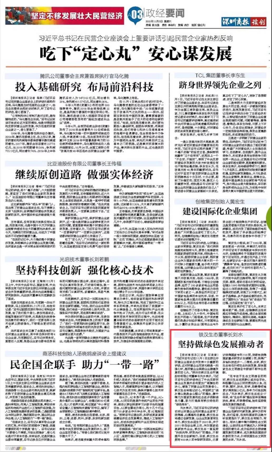 近日,習(xí)近平總書記在民營企業(yè)座談會上的重要講話引起民營企業(yè)家熱烈反響,鐵漢生態(tài)作為生態(tài)環(huán)保龍頭民營企業(yè),劉水董事長積極回應(yīng)。在11月3日《深圳商報(bào)》刊登的“堅(jiān)定不移發(fā)展壯大民營經(jīng)濟(jì)”專題報(bào)道中,劉水表示,習(xí)近平總書記的講話切實(shí)讓民營企業(yè)和民營企業(yè)家有了獲得感、歸屬感和自豪感。鐵漢生態(tài)將銘記初心,牢固...