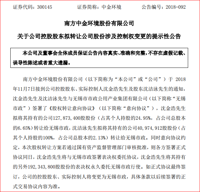 中金環(huán)境公告,公司控股股東、實(shí)際控制人沈金浩及股東沈潔泳與無錫市市政公用產(chǎn)業(yè)集團(tuán)有限公司(以下簡稱“無錫市政”)簽署《股權(quán)轉(zhuǎn)讓意向協(xié)議》。 沈金浩擬將其持有的公司127,873,400股股份(占其個(gè)人持股的24.95%,占公司總股本的6.65%)轉(zhuǎn)讓給無錫市政,沈潔泳擬將其持...