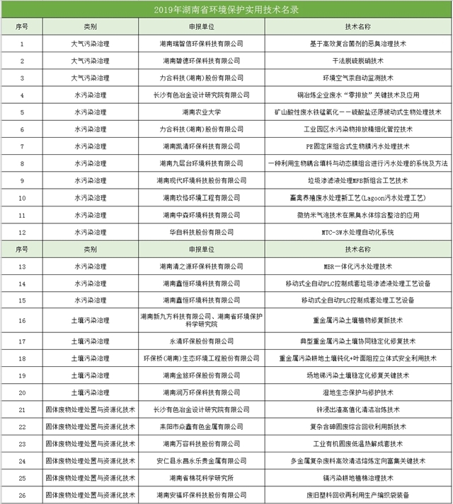 湖南省生態(tài)環(huán)境廳 湖南省科學(xué)技術(shù)廳關(guān)于發(fā)布2019年環(huán)境保護(hù)實用技術(shù)評選結(jié)果的通知 各市州生態(tài)環(huán)境局、科學(xué)技術(shù)局,各有關(guān)單位: 為發(fā)揮環(huán)??萍紕?chuàng)新引領(lǐng)作用,促進(jìn)環(huán)保實用技術(shù)的成果轉(zhuǎn)化和應(yīng)用,引導(dǎo)環(huán)保產(chǎn)業(yè)技術(shù)進(jìn)步,滿足排污單位對環(huán)保技術(shù)和產(chǎn)品的需求,促進(jìn)污染防治工作,省生態(tài)環(huán)境廳、省科學(xué)技術(shù)...